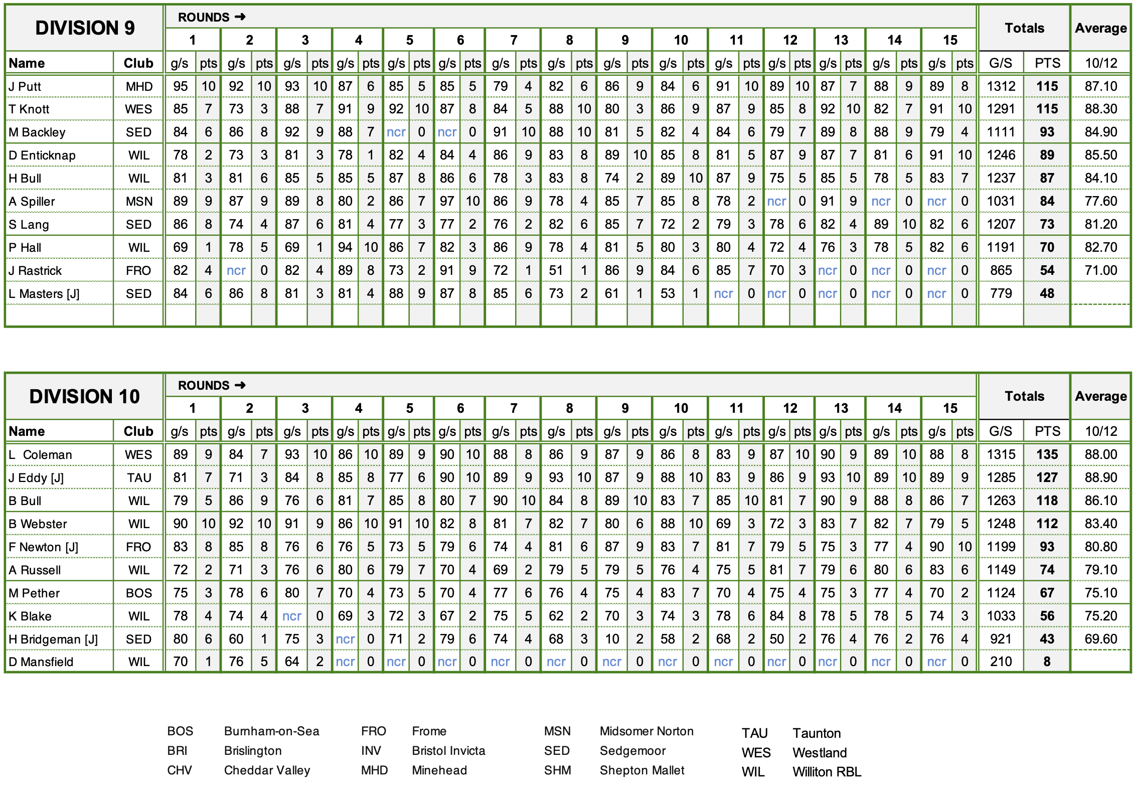 Divisions 9 & 10 - Final Scores