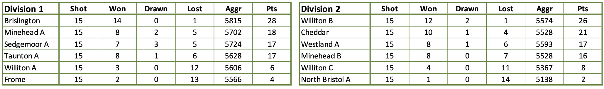 Divisions 1 & 2 - League Standings